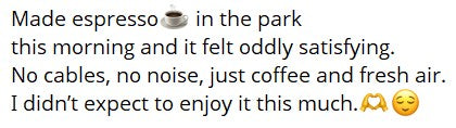 of users say they enjoy making espresso wherever they are — at home, outdoors, or on the road.